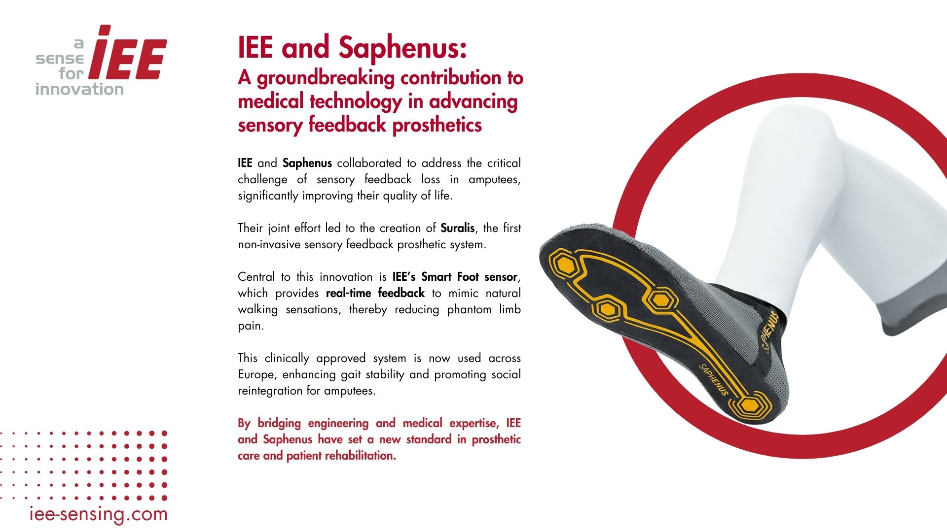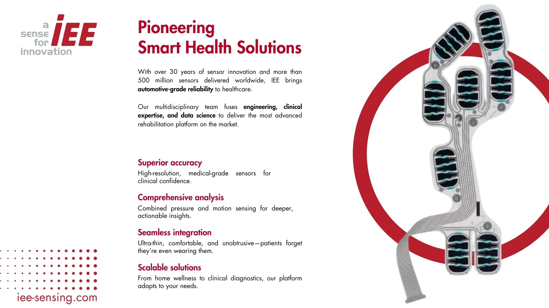 IEE S.A., reconnue pour son leadership mondial dans les systèmes de sécurité intérieure automobile, révolutionne désormais la mobilité personnelle et la santé avec IEE smartHealth – une plateforme intelligente de capteurs intégrés dans les chaussures. Fort de plusieurs décennies d’expertise et de plus de 500 millions de capteurs livrés au secteur automobile, IEE transforme, grâce à ses semelles connectées ultrafines et de qualité médicale, des chaussures ordinaires en dispositifs puissants de surveillance de la santé.