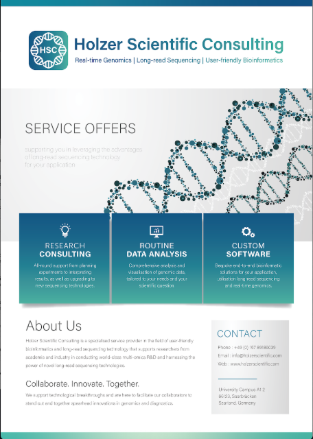 Holzer Scientific Consulting (HSC) est un prestataire de services spécialisé dans le domaine de la bio-informatique conviviale et de la technologie moderne de séquençage d'ADN à lecture longue pour la réalisation de génomique et de métagénomique en temps réel. La société propose des services de conseil, de recherche, de formation et de développement à court et à long terme, y compris des solutions logicielles personnalisées et l'analyse de données. HSC aide ses clients issus du monde universitaire et de l'industrie à mener des activités de R&D de classe Mondiale et à exploiter la puissance des nouvelles technologies de séquençage à lecture longue pour leurs applications. HSC est là pour aider ses clients à se démarquer et à être à la pointe de l'innovation dans le domaine de la génomique et du diagnostic.